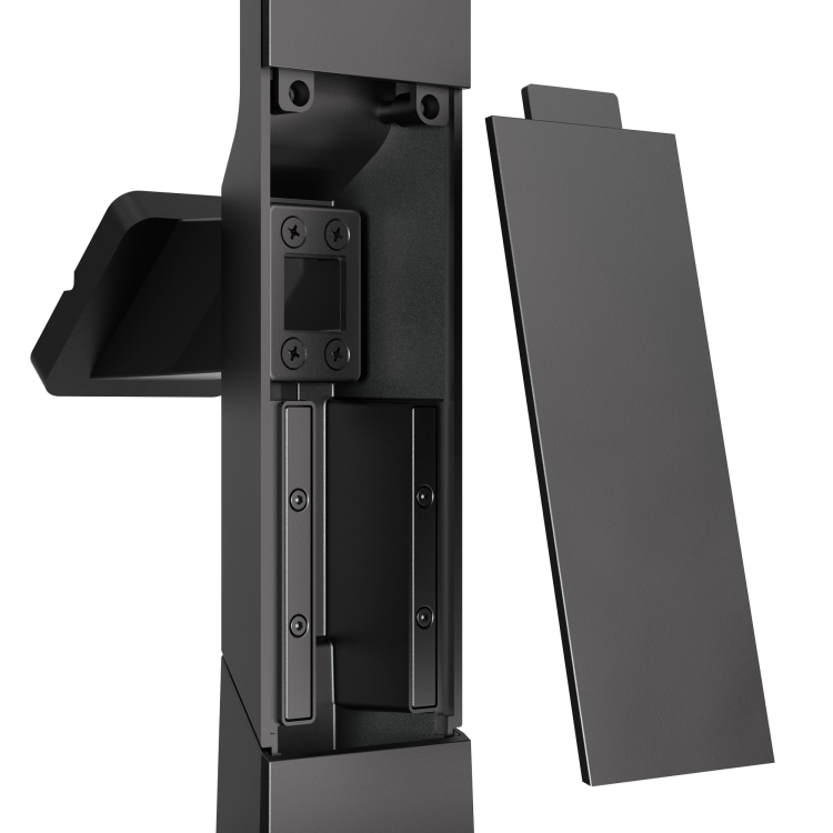 Le support Gemini est doté d’un système de gestion des câbles interne qui peut passer à travers la surface (recommandé pour un montage par vis) ou sortir sur le côté de la base autoportante.-*