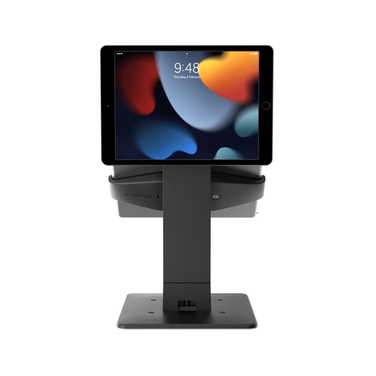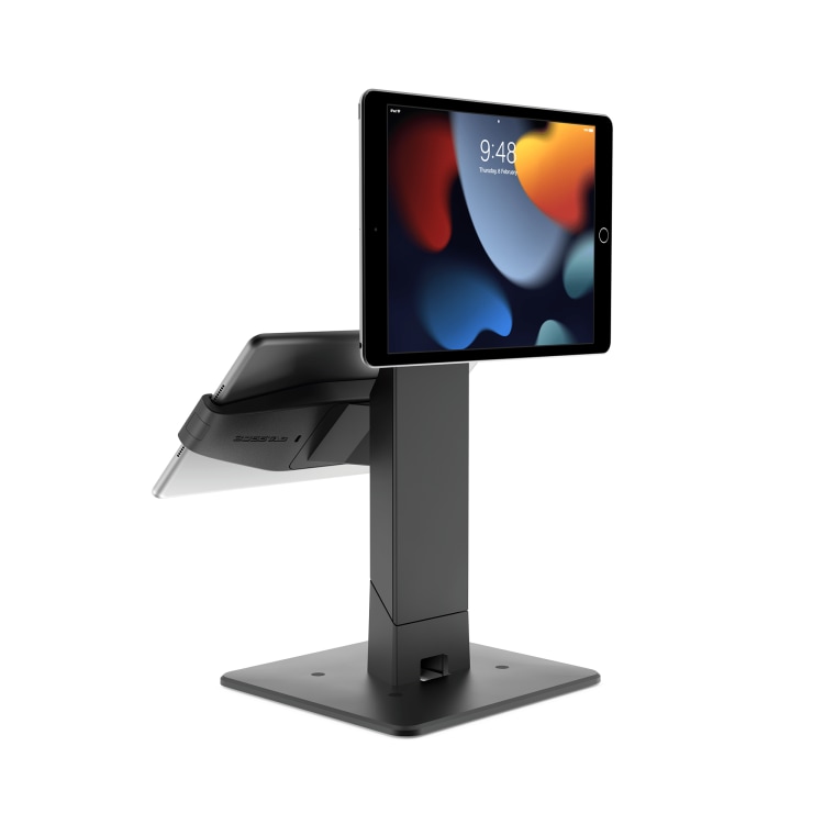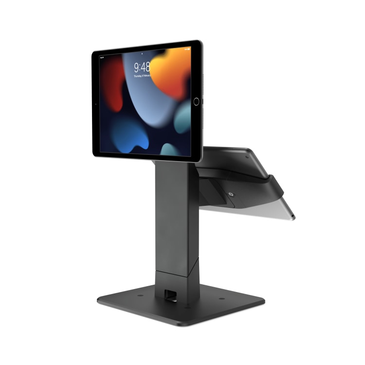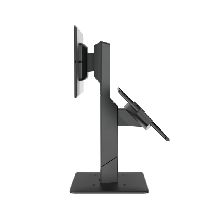 Le Gemini est un support double pour tablettes compatible avec tous les modèles d’iPad et de tablettes. Il offre un réglage d’inclinaison à 45° pour l’écran supérieur. Conçu pour les systèmes de point de vente destinés au personnel et aux clients.