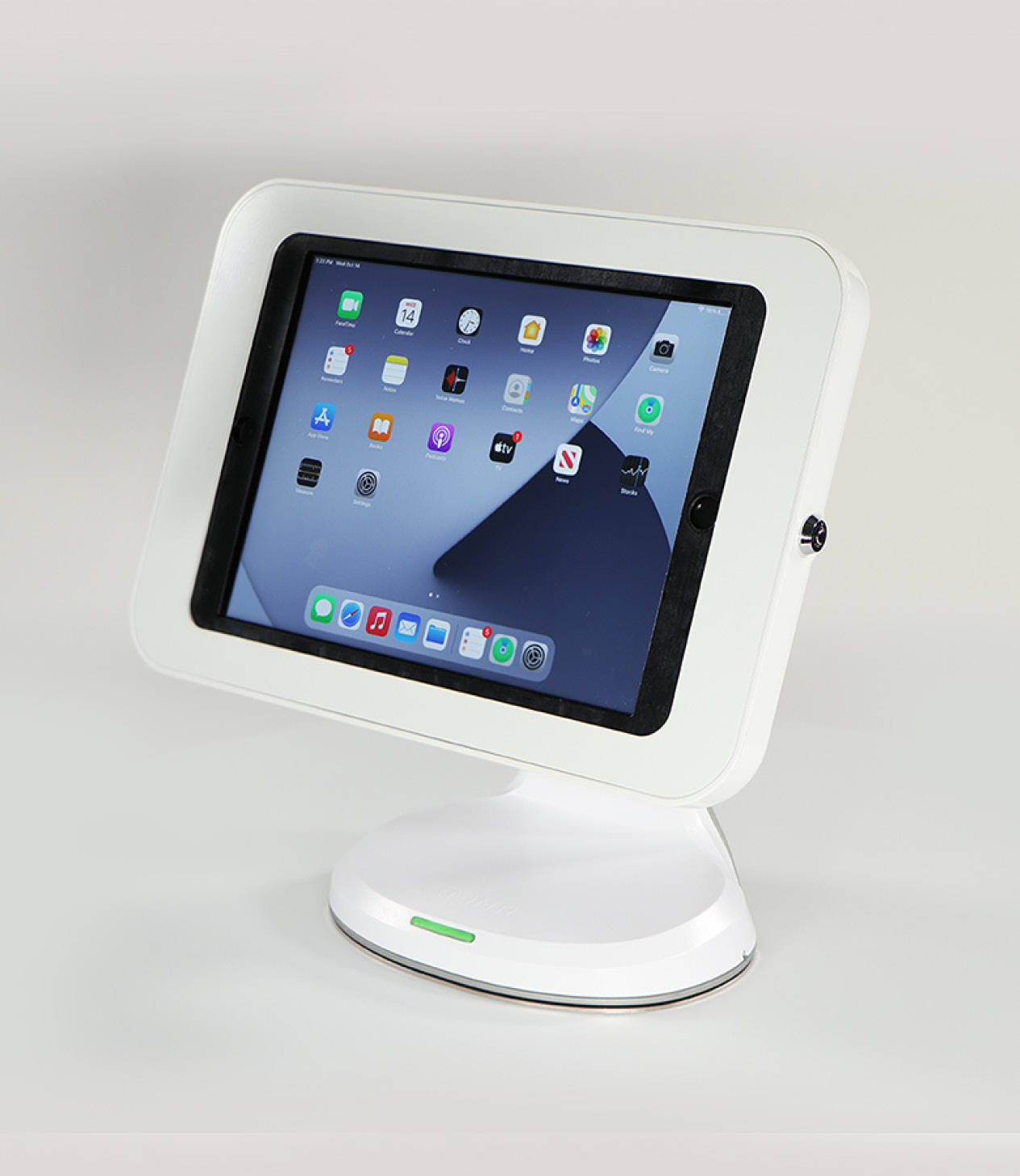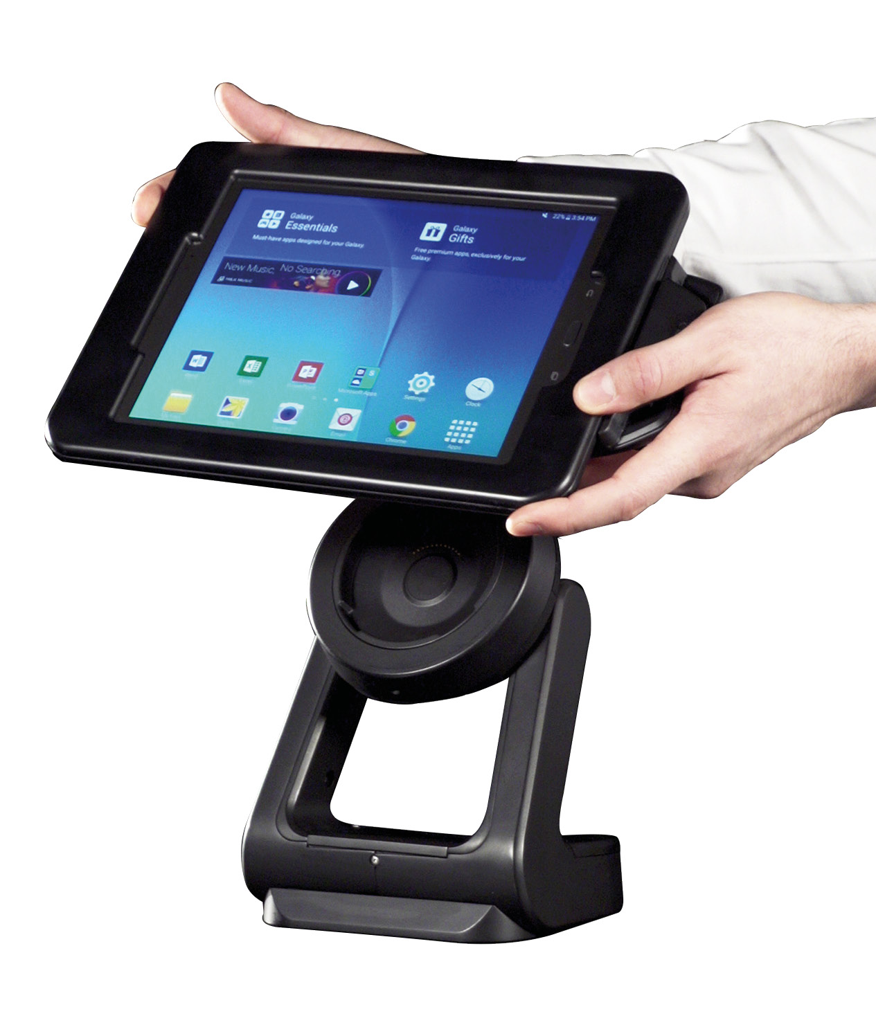 Le support tablette nomade permet au vendeur de se déplacer dans le point de vente avec la tablette, et d’accompagner le client depuis l’accueil jusqu’à la finalisation de son parcours d’achat. Le support possède une poignée à l’arrière de la coque pour une prise en main souple et sécurisée. La tablette peut être posée à tout moment sur son dock pour être rechargée et verrouillée.